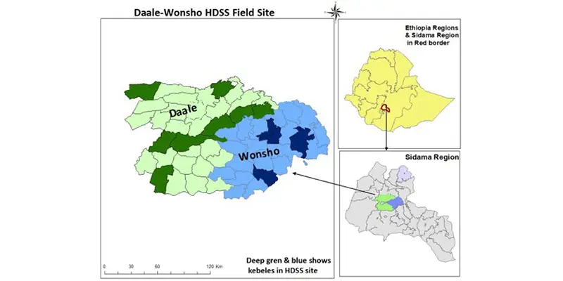 The Dale-Wonsho cohort is located in southern Ethiopia. It is one of the most densely populated areas in southern Ethiopia, with a population density of 533 persons/km2. The Dale district covers an area of 30212km2, situated at latitude 6.69310 or 60 41’35’’N and longitude 38.354610 or 380 21’ 17’’E, with a population of 268839 people and an estimated 53768 households. Dale district consists of 36 rural and two urban kebeles, which are the lowest administrative structures. Wonsho district covers an area of 14528km2, inhabited by 129730 people living in 17 rural and one urban kebele, with a total of 21857 households. Both districts are renowned for their coffee and crop production and sale. Dale district has 10 health centres and 33 health posts, whereas Wonsho district has five health centers and 17 health posts. Agriculture is the primary source of income for the inhabitants of the site, who primarily produce Enset (false banana), coffee, maize, teff, barley and a variety of fruits, vegetables and livestock. There is one government general hospital and 15 health centres that provide medical services, as well as 53 health posts and eight private clinics.